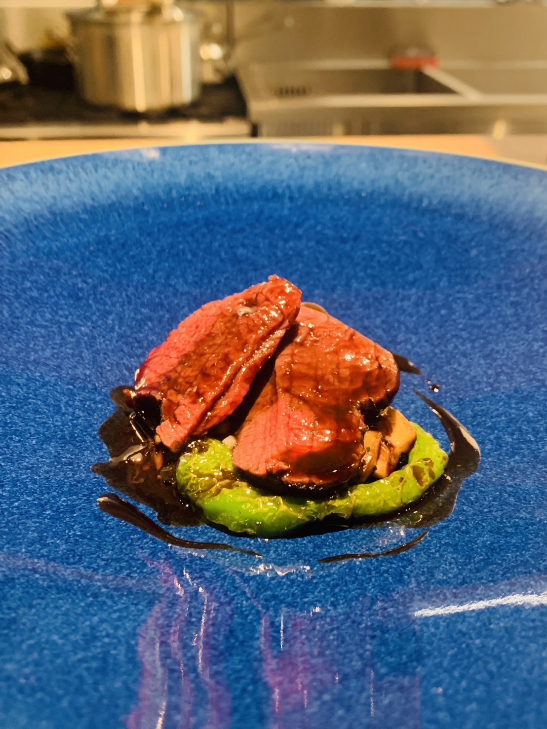ベイシスでは蝦夷鹿ロース肉の周りをバターの香りをうつしながらパリッ焼き、優しくオーブンで火入れしました。ソースにはポワブラードソース(胡椒のきいた赤ワインソースです)にベリーやローズマリーの香りを持つ『タスマニアペッパー』を使用しお出し致します。